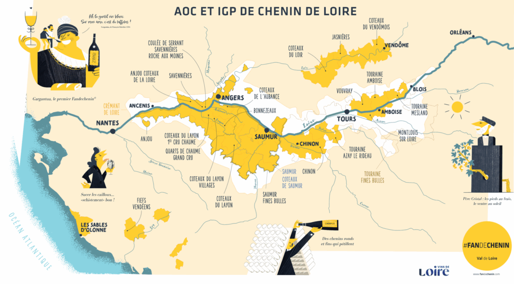En Val de Loire, il est utilisĂ© dans 20 AOP diffĂ©rentes (Anjou, Savenières, Coteaux du Layon, Saumur, Touraine, Vouvray, Montlouis-sur-Loire…) et l’IGP Val de Loire qui se sont structurĂ©es en 2018 en un collectif : Fan de chenin.